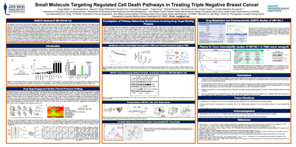 Venkata Maidhar Yenugonda M.Phil, Ph.D.Venkata Maidhar Yenugonda, M.Phil, Ph.D., Associate Professor in the Department of Translational Neurosciences, and Director of Drug Discovery and Nanomedicine Research Program at the Saint John’s Cancer Institute, presented at the 2019 San Antonio Breast Cancer Symposium®, on December 13, 2019. His Poster entitled: Small Molecule Targeting Regulated Cell Death Pathways in Treating Triple Negative Breast Cancer, was well received!